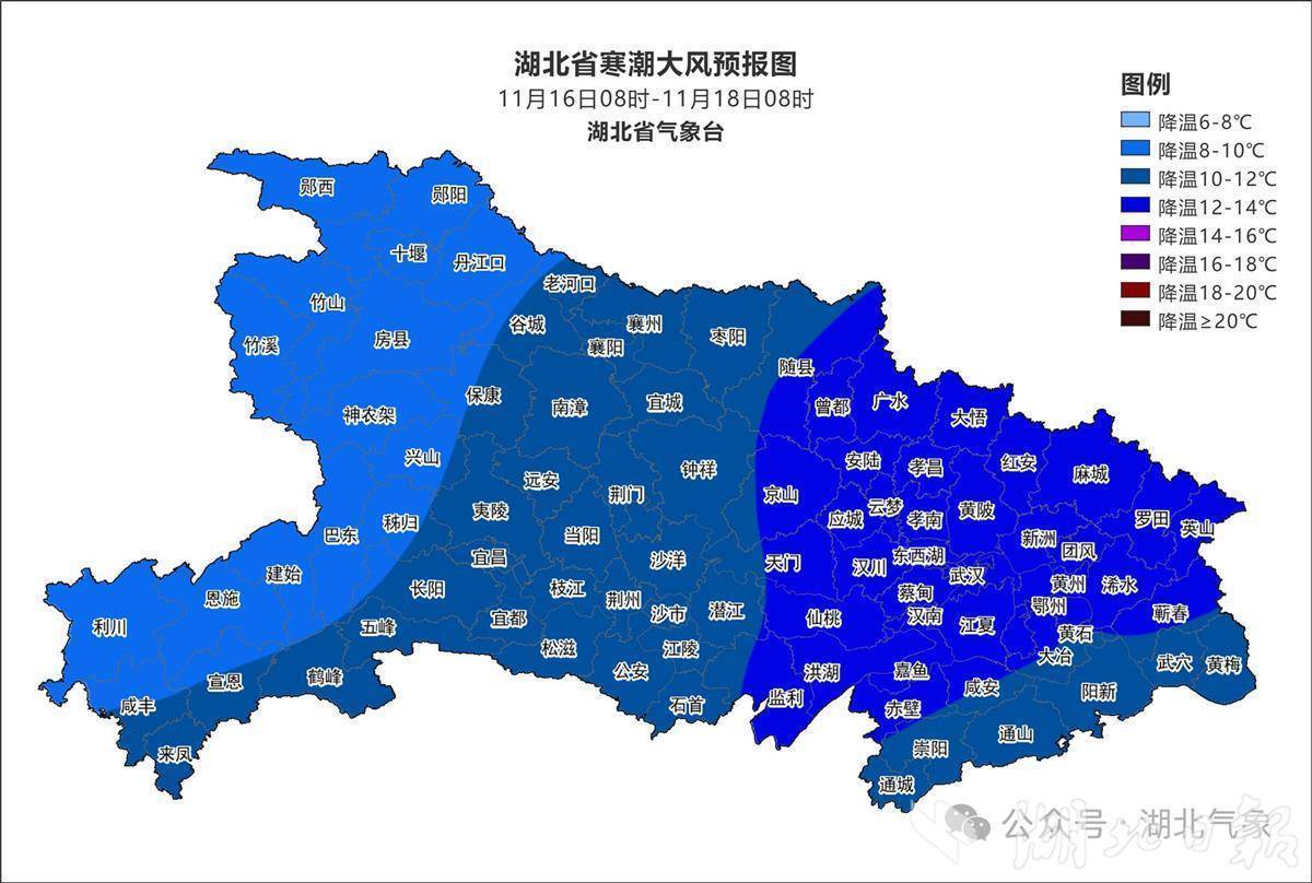 湖北日报讯(记者曾莉)11月16日7时16分,湖北省气象台发布下半年首个寒潮大风黄色省级预警:预计16日下午至17日将有寒潮大风天气,大部地区平均气温下降8至12℃,其中随州、荆门东部、荆州东部、天门、仙桃、武汉、孝感、黄冈、鄂州、咸宁等地下降12至14℃,19日凌晨全省最低气温降至-3至3℃;期间有偏北风4到6级、阵风7到9级;16日后半夜至17日白天,十堰、襄阳、神农架、恩施北部、宜昌等地山区有雨夹雪或雪(1200米以上高山区中到大雪)。建议加固临时搭建物、避免高空作业,防范对交通航运、设施农业、在田作物、人体健康等的不利影响。